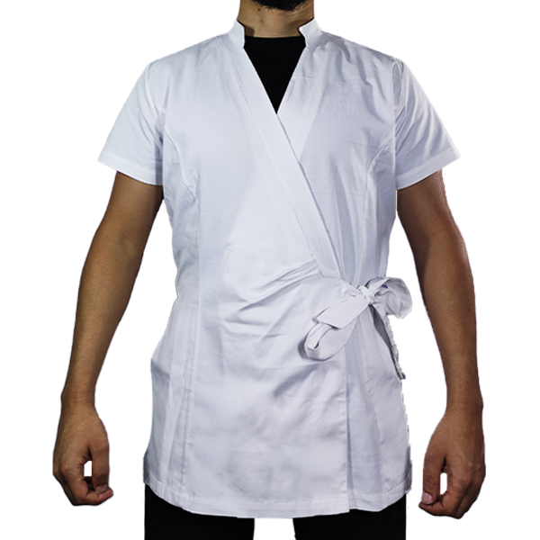 Bata Ajustável Sublime Branca com gola mandarim, manga curta e tecido leve. Possui dois bolsos frontais.