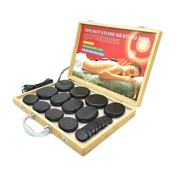 Maleta aquecedora com 20 pedras de massagem para massagem geotermal e tratamentos de spa. A maleta elétrica aquece as pedras até uma temperatura de 60ºC. Prática e cómoda, transporta as pedras, deixando-as organizadas e aquece-as. Pedras com vários tamanhos para diferentes locais do corpo.