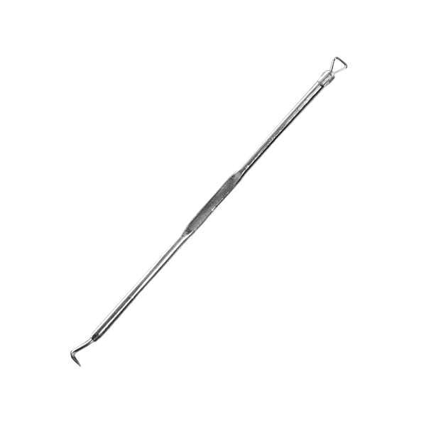 Extrator de ponta dupla, para a extração das impurezas acumuladas nos poros, após a limpeza da pele. Uma ponta mais fina, em agulha, e outra em forma de colher para recolher a impureza.