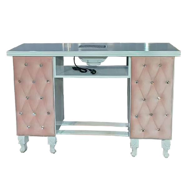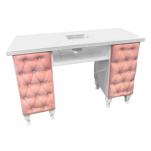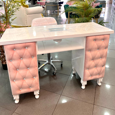 Mesa Princess com aspirador incorporado. Estofos almofadados em veludo rosa, com adornos de pedras brilhantes, e pés com acabamentos trabalhados. Possui seis gavetas e uma prateleira por baixo do aspirador. Materiais robustos, com alta-qualidade. Ideal para profissionais da área de estilismo de unhas.