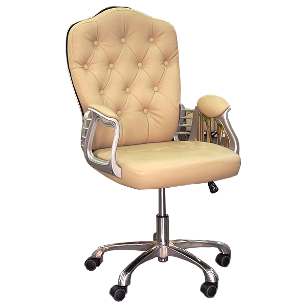 Cadeira Glamour Soft com rolamentos, estrutura em alumínio resistente, elevação vertical e acabamentos prateados. Possui estofos em capitoné confortáveis, acolchoados e em napa fácil de limpar. Proporciona uma postura confortável e apoio de braços para a melhor ergonomia.