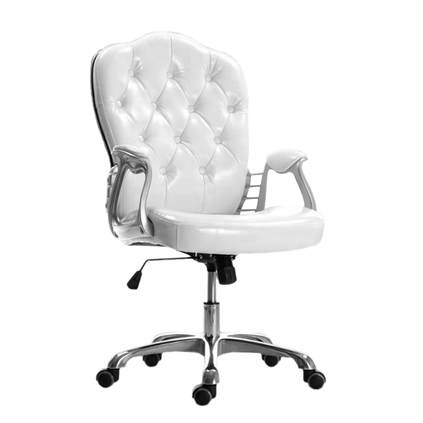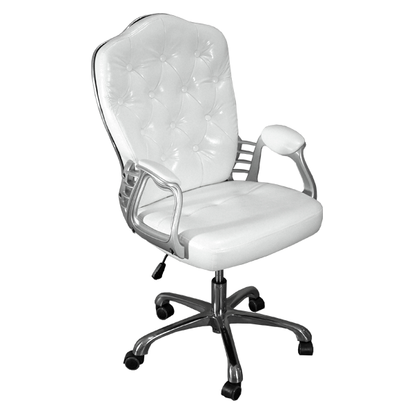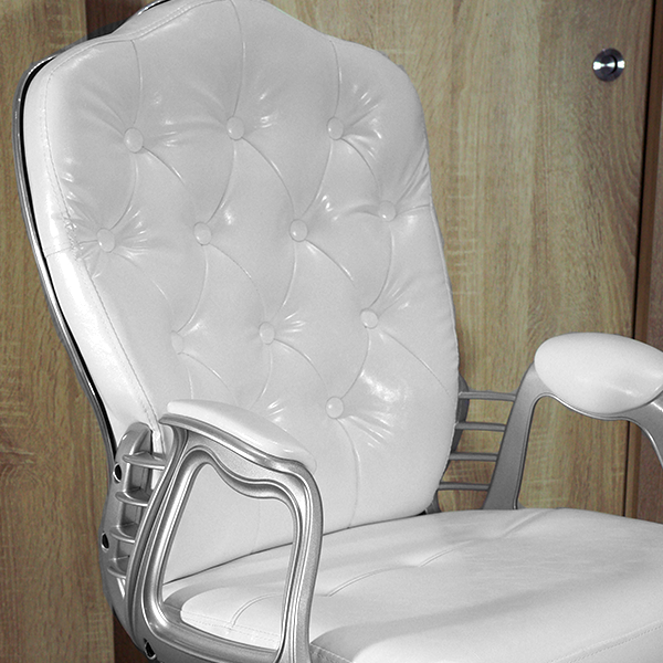 Cadeira Glamour Soft com rolamentos, estrutura em alumínio resistente, elevação vertical e acabamentos prateados. Possui estofos em capitoné confortáveis, acolchoados e em napa fácil de limpar. Proporciona uma postura confortável e apoio de braços para a melhor ergonomia.