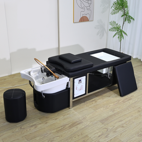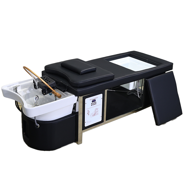 Estação completa de lavagem de cabeça, estilo Head Spa Japonesa, com uma bacia de cerâmica que já inclui a torneira de Head Spa, apoio de cabeça ajustável e chuveiro de lavagem (para utilizar o chuveiro tem que ligar a estação à canalização de água). Ainda inclui uma bacia na zona dos pés para pedicure ou spa dos pés. Estrutura em aço inoxidável, materiais em napa resistentes e fáceis de limpar, almofadas que podem ser retiradas ou colocados para transformar numa marquesa/estação de lavagem.