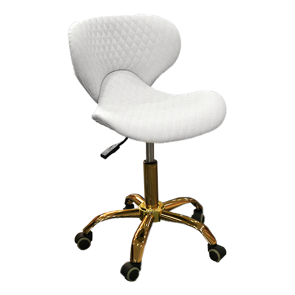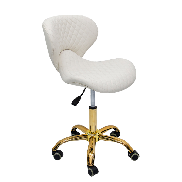 A Cadeira Beauty White possui estofos em napa com efeito decorativo cruzado, rolamentos, uma estrutura metálica de alumício lacada em dourado e elevação vertical.