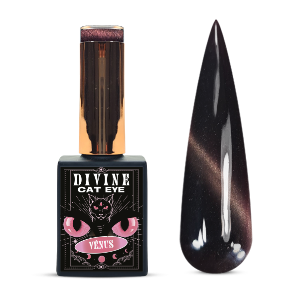 A sua cobertura é brilhante, com efeito cat eye: consegue manipular e mover os glitters do verniz com um íman.