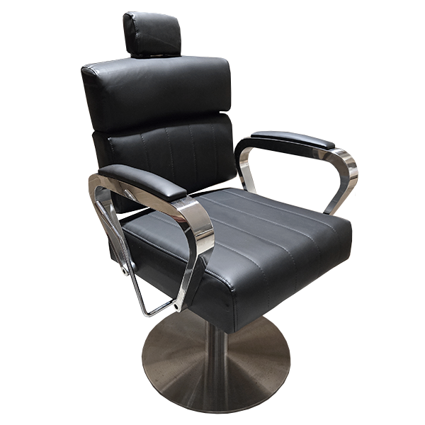 Cadeira Sublime Preta profissional, projetada para barbeiros, cabeleireiros e salões de beleza. Acabamentos todos prateados, tanto no pé como nos apoios de braços. Com ajuste em altura e giratória. Os apoios de braço e cabeça foram projetados para garantir o maior conforto, assim como toda a superfície da cadeira estofada em napa de alta qualidade, fácil de higienizar, e com um enchimento confortável.
