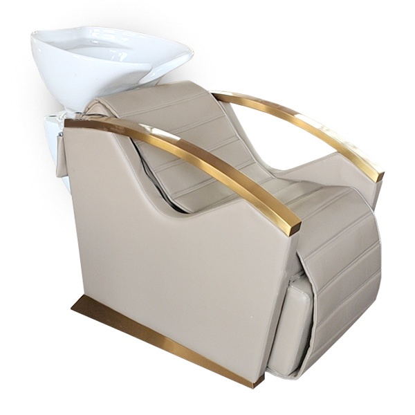 Calha Prestige Bege com apoio de braços e pés, acabamentos dourados e bacia de cerâmica branca. Uma calha que oferece conforto, estilo e elegância, com um design ergonómico e materiais com alta qualidade, napa em cor bege, estofos almofadados e estrutura maciça. Chuveiro manual cromado.