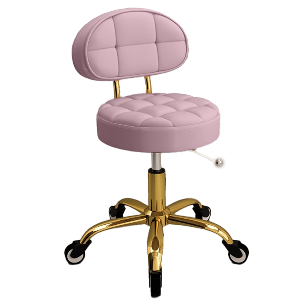 Cadeira almofadada e confortável, com apoio de costas e rolamentos para uma fácil deslocação. Com estrutura em acido inoxidável e lacada a dourado, é ajustável em altura.
