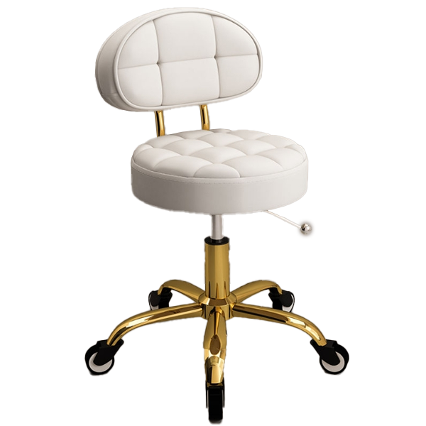 Cadeira almofadada e confortável, com apoio de costas e rolamentos para uma fácil deslocação. Com estrutura em acido inoxidável e lacada a dourado, é ajustável em altura.