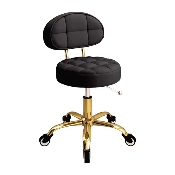 Cadeira almofadada e confortável, com apoio de costas e rolamentos para uma fácil deslocação. Com estrutura em acido inoxidável e lacada a dourado, é ajustável em altura.