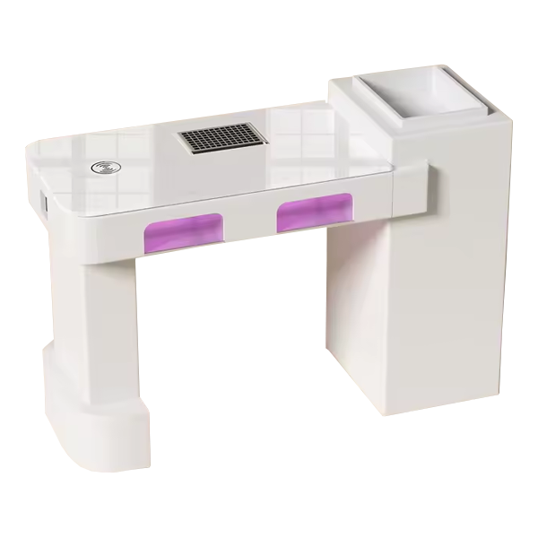 Mesa Signature com aspirador integrado. Mesa robusta de MDF, durável e resistente, com espaço integrado para colocação de dois catalisadores. Tampo com efeito marmorizado.