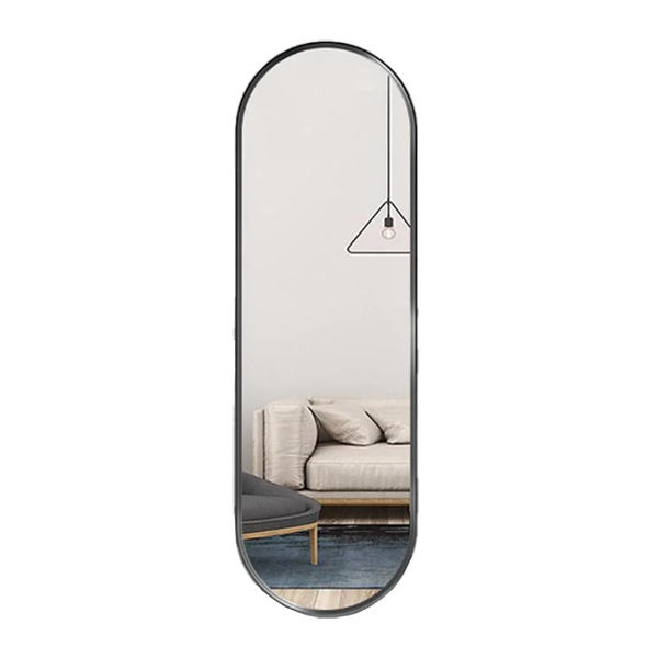 Espelho oval minimalista, com borda prateada, para salões, cabeleireiros, barbeiros. Proporciona ao seu salão um toque de elegância discreto e sofisticado, combinando com todo o espaço de forma harmoniosa.