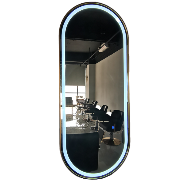 Espelho dourado com luz LED para salões, cabeleireiros e barbeiros. Formato oval e minimalista, que combina com qualquer decoração, proporcionando um toque de elegância discreta.