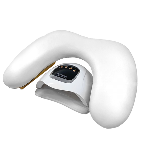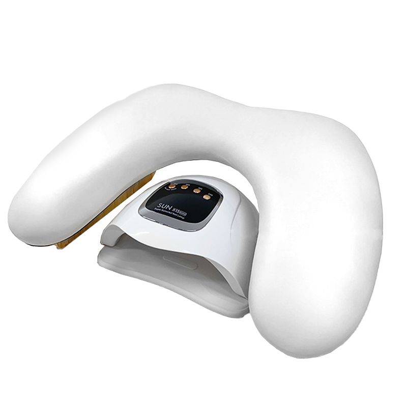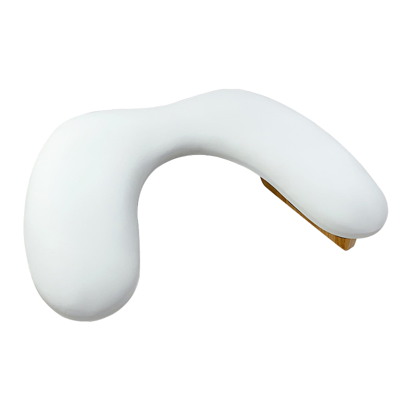 Apoio de mãos almofadado em napa branca, que proporciona uma melhor ergonomia, mais conforto e praticidade durante o trabalho em mesa, apto para estilismo de unhas e manicure. Estrutura de pés em madeira.