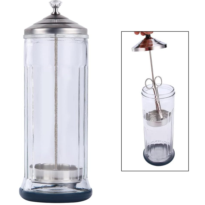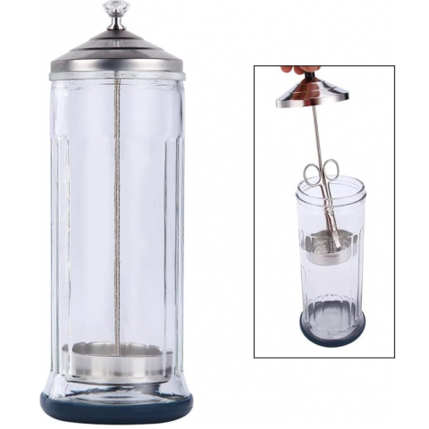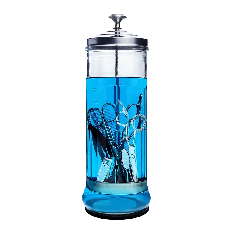 Recipiente esterilizador de ferramentas de barbearia, onde pode colocar um líquido que desinfete e esterilize as ferramentas, contendo-as num só local. Fabricado com tampa e cesto em ácido inoxidavel e o exterior em vidro resistente. A base é anti-aderente, para não escorregar em superfícies lisas. Tamanho grande para caber várias ferramentas de uma só vez. Para desinfeção de tesouras, pentes, navalhas, etc.