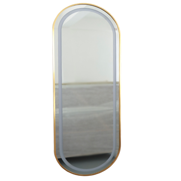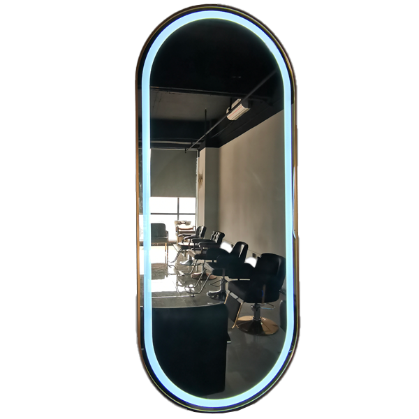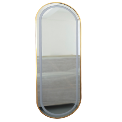 Espelho dourado com luz LED para salões, cabeleireiros e barbeiros. Formato oval e minimalista, que combina com qualquer decoração, proporcionando um toque de elegância discreta.