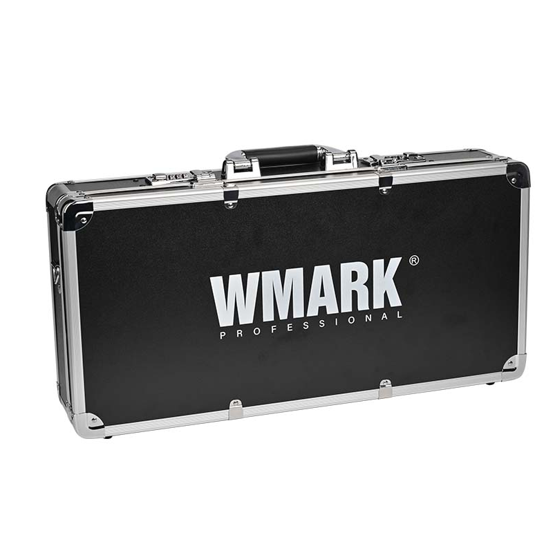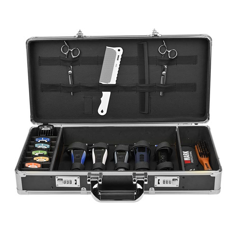 Mala de barbeiro para transporte e arrumação de ferramentas e máquinas de barbearia. Conta com uma estrutura rígida e com acabamentos prateados, fechaduras com cadeado e uma alça. As fitas e espaços compartimentados acomodam as várias ferramentas, como tesouras e pentes ou lâminas e pentes guia e também as prórprias máquinas de barbear e cortar cabelo. Ideal para os profissionais que se deslocam com frequência e que fornecem os seus serviços ao domicílio, ou para todos aqueles que queiram encontrar uma maneira prática e cómoda de organização.
