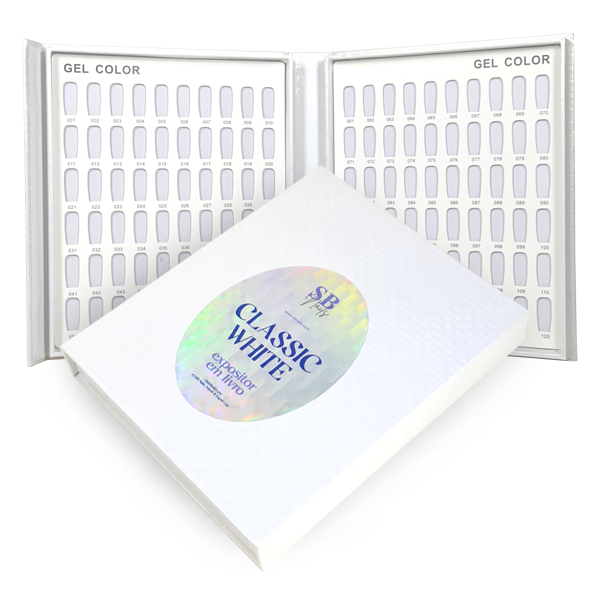 Expositor em Livro para expor as cores e coleções de verniz de gel. Livro CLassic em branco perolado. Capacidade para colocar até 120 cores e designs diferentes.