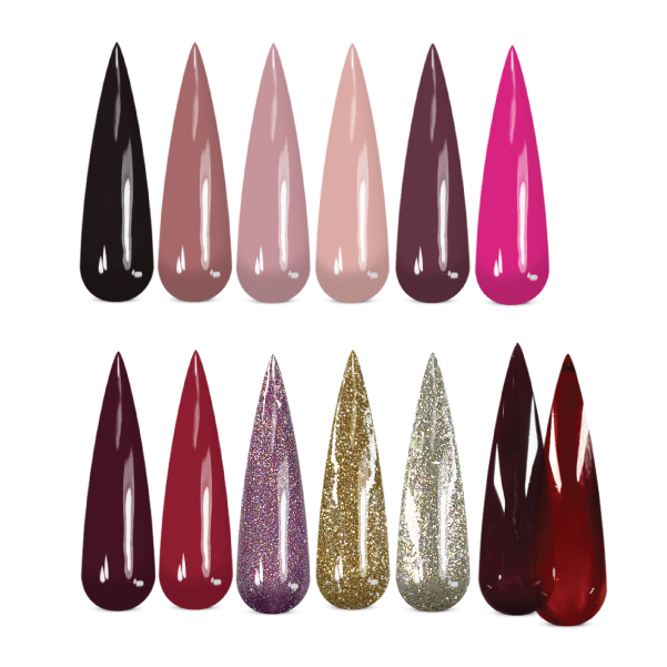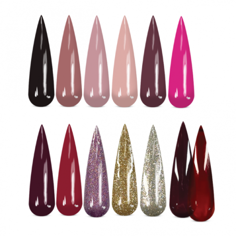 São 12 cores de Verniz Gel + 1 Base Construtora + 2 Finalizadores (1 glass + 1 aurora boreal com microglitter)