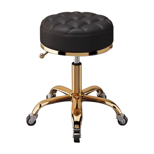 Banco com acabamentos dourados, assento acolchoado em napa preta e estilo capitoné. Estrutura em aço inoxidável, leve e resistente. O banco possui 5 rolamentos para uma fácil deslocação e praticidade e é ajustável verticalmente em altura. Projetado para salões de barbearia, cabeleireiro, centros de estética, manicure e pedicure, SPAs, entre outros.