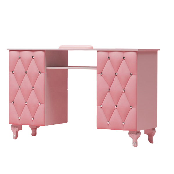 Estofos almofadados em veludo rosa, com adornos de pedras brilhantes, e pés com acabamentos trabalhados. Aspirador e apoio de mãos embutido. Materiais robustos, com alta-qualidade. Ideal para profissionais da área de estilismo de unhas.