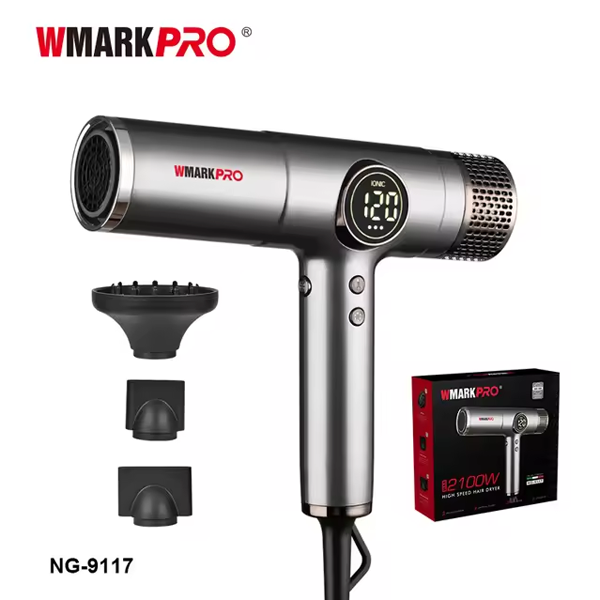 Secador de alta velocidade com 1200-2100W, função iónica, display LED, motor sem escovas de longa vida útil e voltagem universal. Possui ainda função de limpeza automática, proteção contra sobre-aquecimento e display LED com temperatura. O secador tem 4 níveis de temperatura, 3 velocidades e um botão de ar frio. Com iões negativos que suavizam e hidratam o cabelo, reduzindo o frizz.