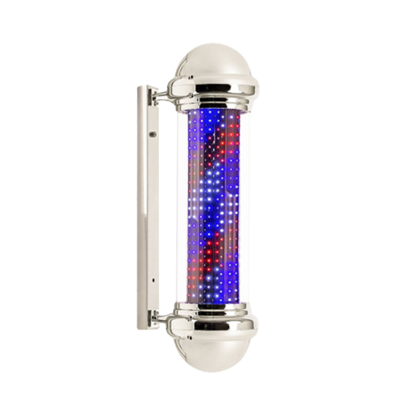 O polo de Barbeirio proporciona um ar sofisticado ao salão e ao mesmo tempo mantém o visual tradicional das barbearias clássicas, com o seu cilindro rotatório com luzes LEDs azuis e vermelhas