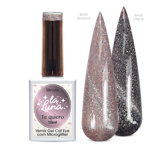 A sua cobertura é com efeito cat eye, possui microglitters que conseguem ser manipulados com um iman.
