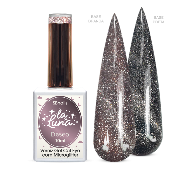 A sua cobertura é com efeito cat eye, possui microglitters que conseguem ser manipulados com um iman.