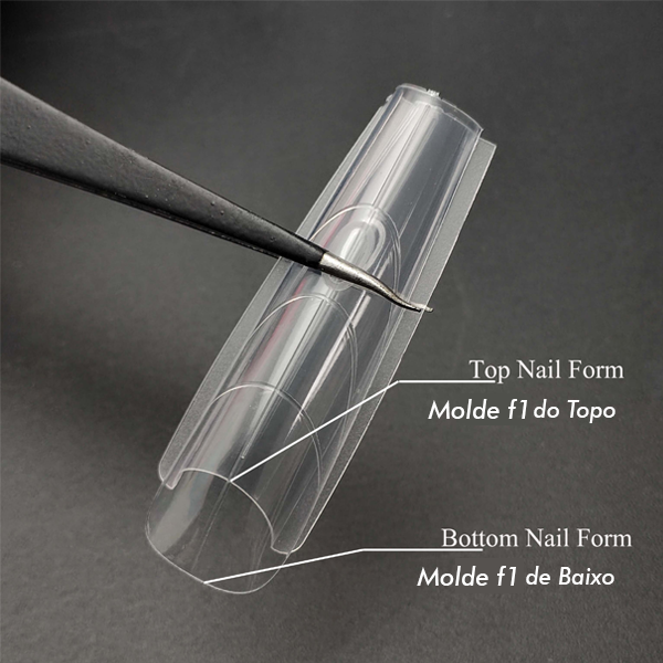 Molde F1 "Sandwich" Formato Extremo é o inovador molde que irá diminuir o tempo em mesa, pois elimina o tempo de acabamento do excesso debaixo da unha após o alongamento com moldes. É composto por um molde que fica em cima, reutilizável, que lhe permite criar a extensão, tal como os tradicionais moldes F1; e uma parte que fica por baixo da unha, o que proporciona suporte extra e um acabamento perfeito por baixo da unha.
