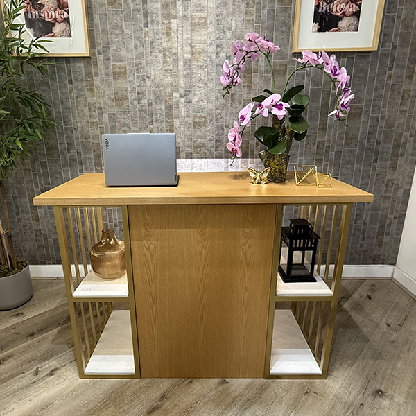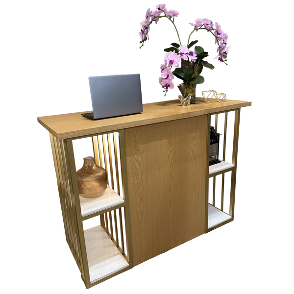 Recepção Luxury Golden de madeira, possui uma estrutura e materiais de alta qualidade, e pode ser utilizada em espaços de beleza, em salões de cabeleireiro ou barbearias, em SPAS, manicures, etc. Vem integrada com uma tira de luz LED no interior. Pode ainda colocar a arrumação ou decoração extra que necessitar, devido às suas prateleiras com efeito mármore branco. Estrutura com acabamentos dourados. Recepção com linhas elegantes e sofisticadas que complementa e se integra em qualquer tipo de espaço.