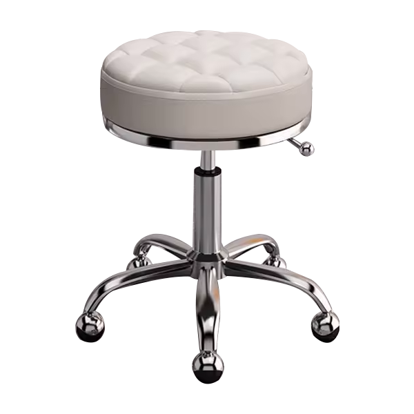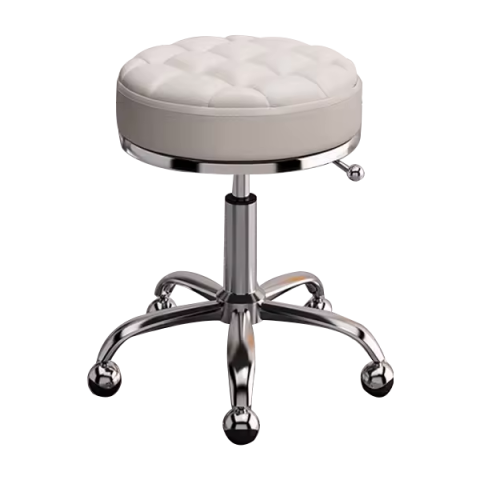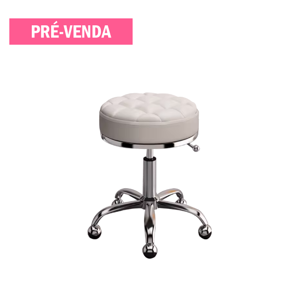 Banco com acabamentos prateados, assento acolchoado em napa creme e estilo capitoné. Estrutura em aço inoxidável, leve e resistente. O banco possui 5 rolamentos para uma fácil deslocação e praticidade e é ajustável verticalmente em altura. Projetado para salões de barbearia, cabeleireiro, centros de estética, manicure e pedicure, SPAs, entre outros.