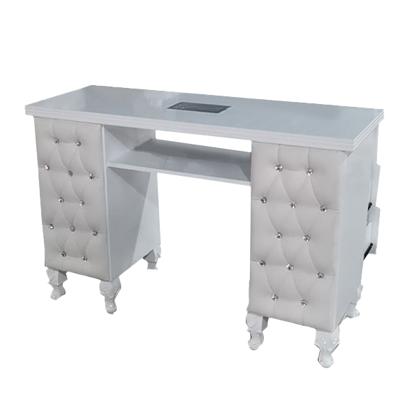 Estofos almofadados em veludo rosa, com adornos de pedras brilhantes, e pés com acabamentos trabalhados. Aspirador e apoio de mãos embutido. Materiais robustos, com alta-qualidade. Ideal para profissionais da área de estilismo de unhas.