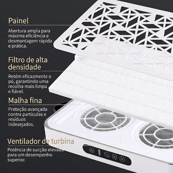 Turbo Sucção Inteligente: Equipado com um motor de última geração que gera um vácuo potente, capaz de capturar 99,9% das partículas de pó de gel, acrílico e fibra de vidro no momento exato do lixamento.