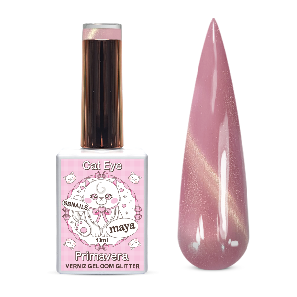 A sua cobertura é com efeito cat eye, possui microglitters que conseguem ser manipulados com um iman.